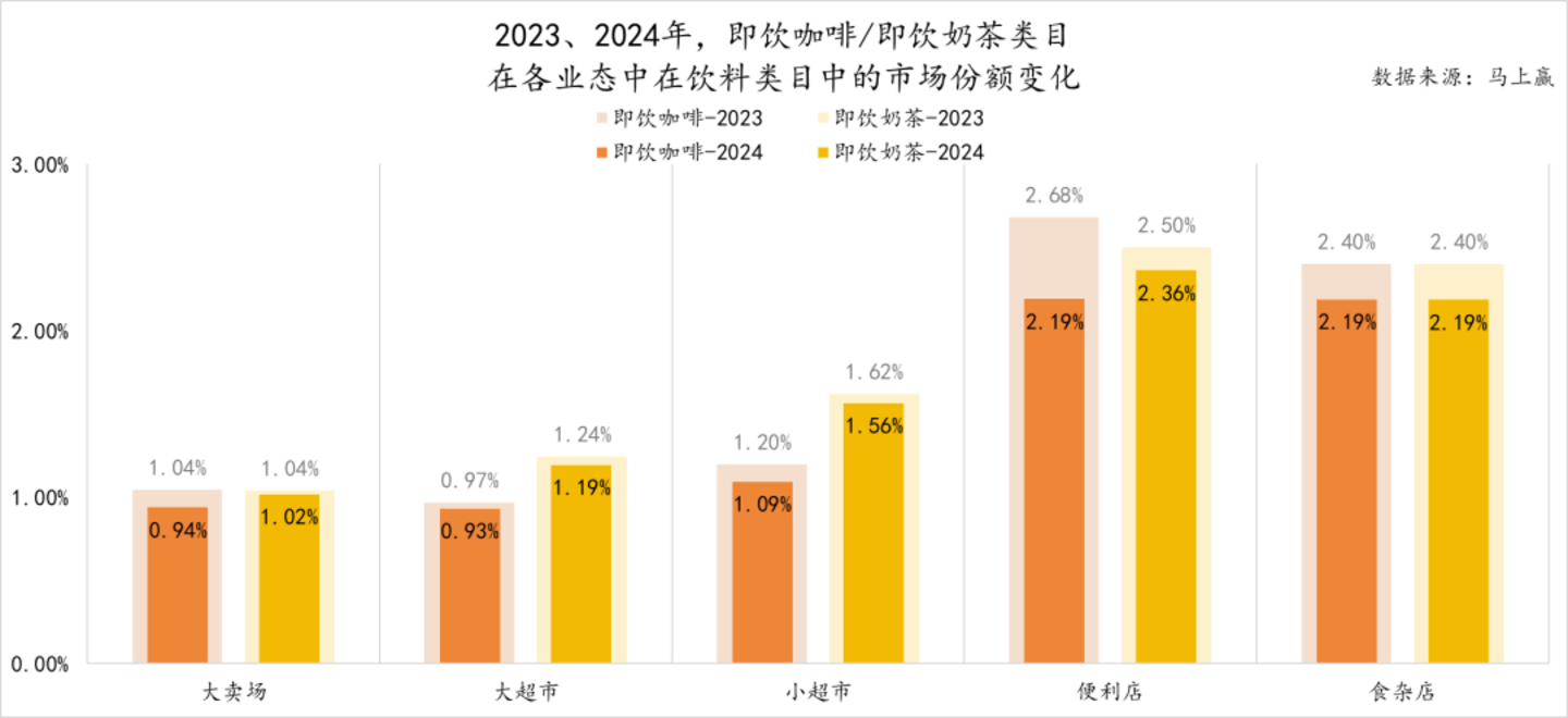 马上赢品牌CT中的数据显示,2023、2024年,即饮咖啡/即饮奶茶在饮料类目中的市场份额,已经均不足2%,且两个类目在2024年同比2023年,市场份额均有所下滑,即饮咖啡同比下滑13.48%,即饮奶茶同比下滑5.91%。