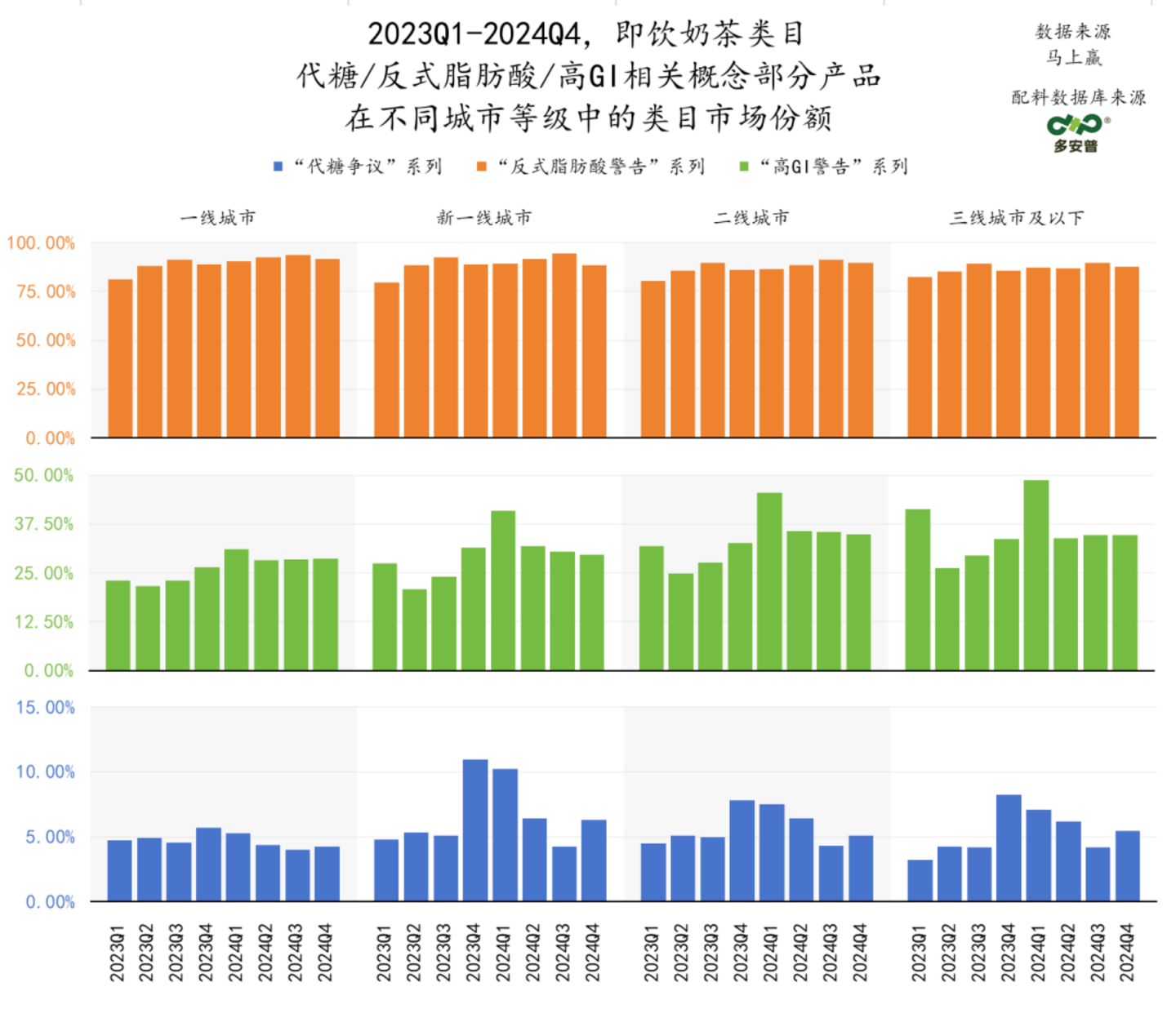交叉城市等级来看这部分产品(Top 20 SKU)中各原料概念在类目内的市场份额情况:
