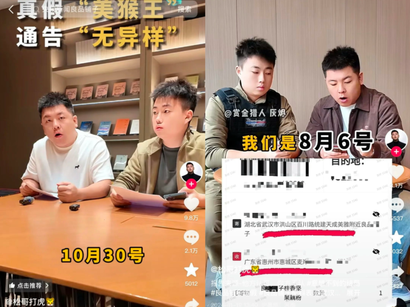 尽管后续调查结果显示,良品铺子委托生产的藕粉、酸辣粉,并不存在举报人所反映的 “检测出木薯成分”“未检出红薯成分” 等问题,但松哥打虎借助这一事件,迎来了泼天流量,多条相关视频点赞超过20万,账号粉丝数量从事发前的80多万,翻倍增长至170余万。