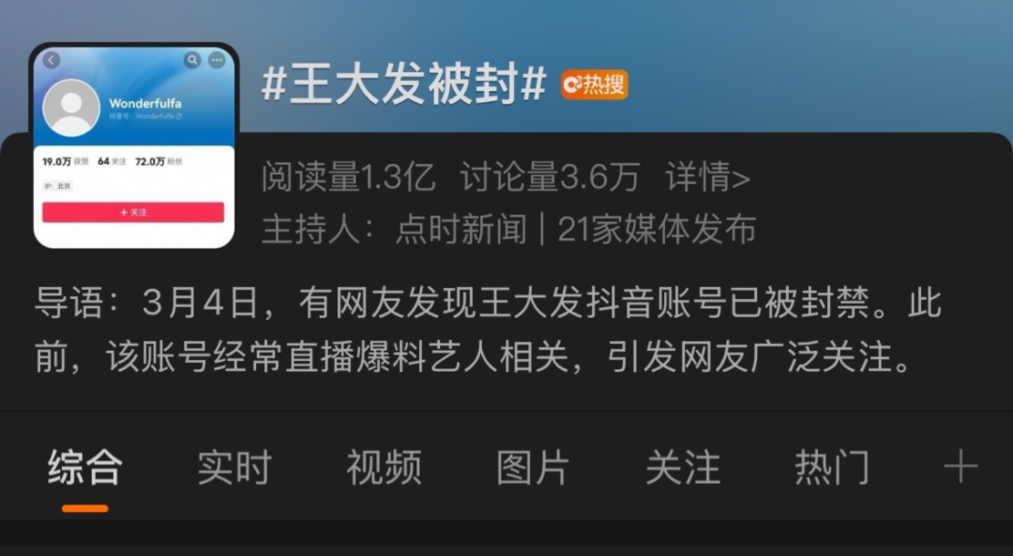 后有拥有千万粉丝量级的网红顾茜茜遭遇全网封杀,在抖音、快手、微博等主流平台上,其账号均显示 “违反相关法律法规和平台规定”,3月4日,话题#王大发被封#冲上热搜榜首,引发网友广泛热议。