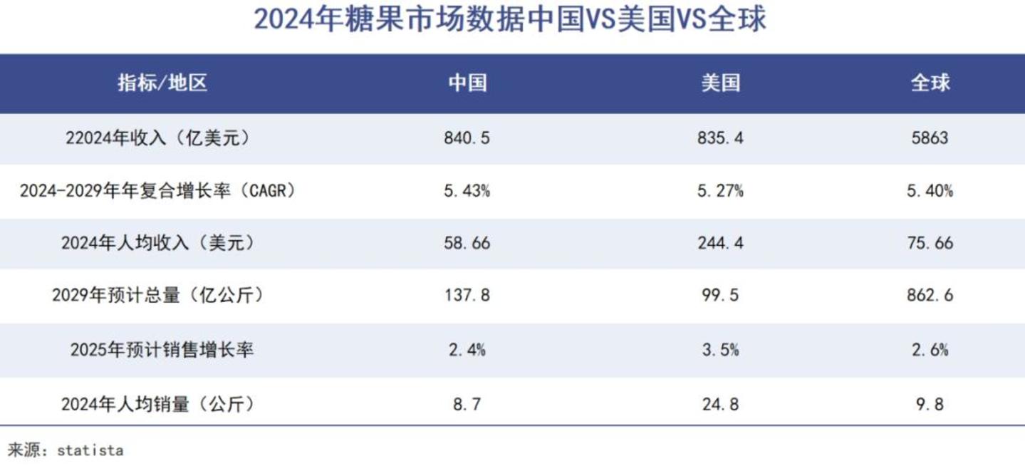 尽管面临健康化转型压力,但凭借着庞大的人口基数,中国糖果市场规模仍稳居全球前列,乐观的估计是未来五年复合增长率预计保持5%-7%。