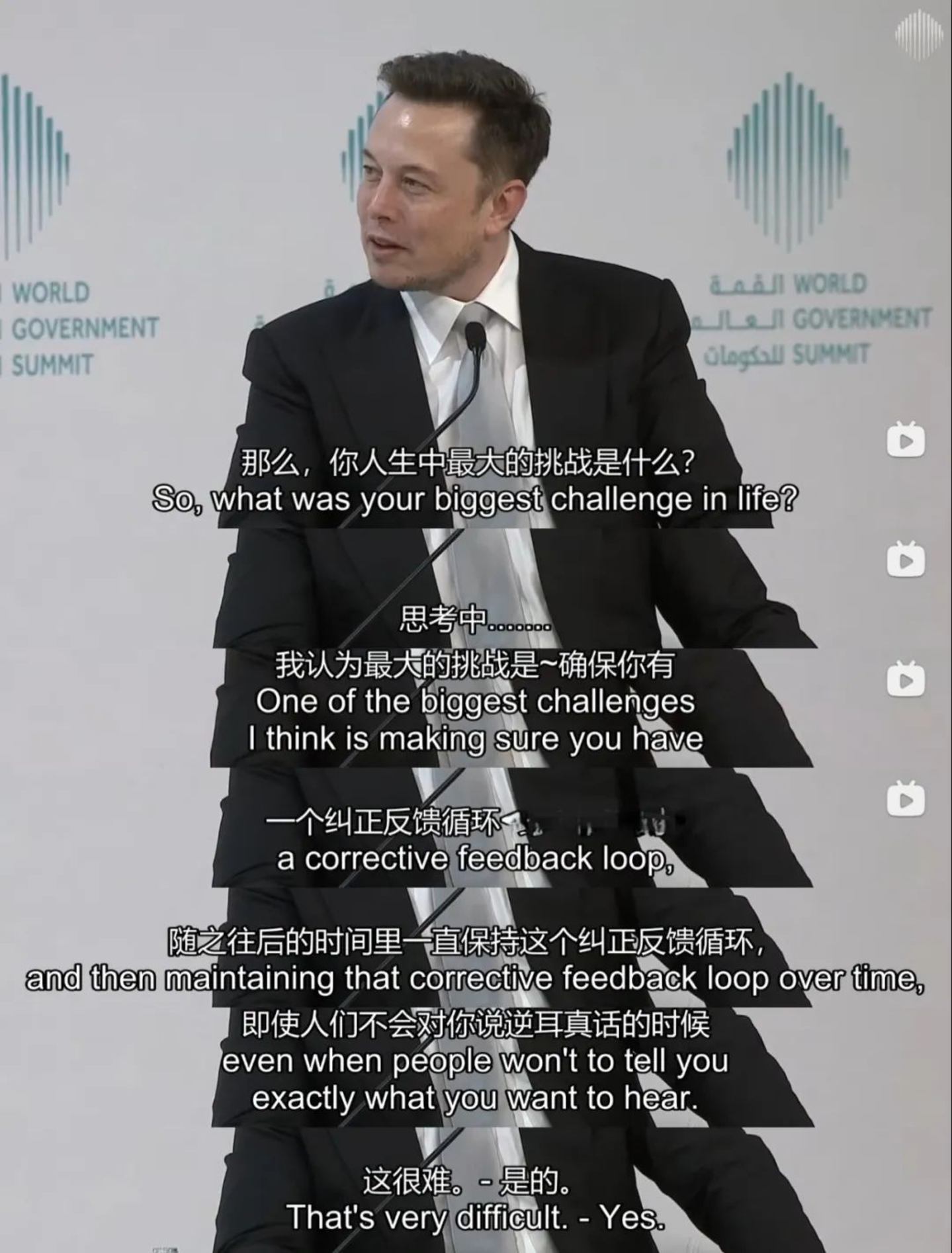 这也正是段永平一直强调的「想本质,想长远、知错就改」。英雄所见略同,马斯克对此也有类似表述,在一次媒体采访中他强调,人生最大的挑战是确保你有一个纠错反馈机制。