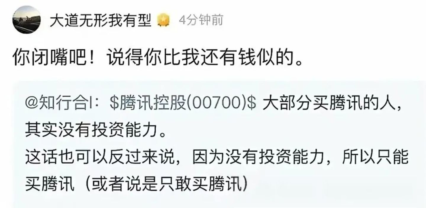 今年2月,有网友发帖称「雪球上大部分买腾讯的人,其实没有投资能力。这话也可以反过来说,因为没有投资能力,所以只能买腾讯(或者说是只敢买腾讯)。」这个观点莫名惹怒了段永平,并招致他的训斥式评论,「你闭嘴吧!说得你比我还有钱似的」。
