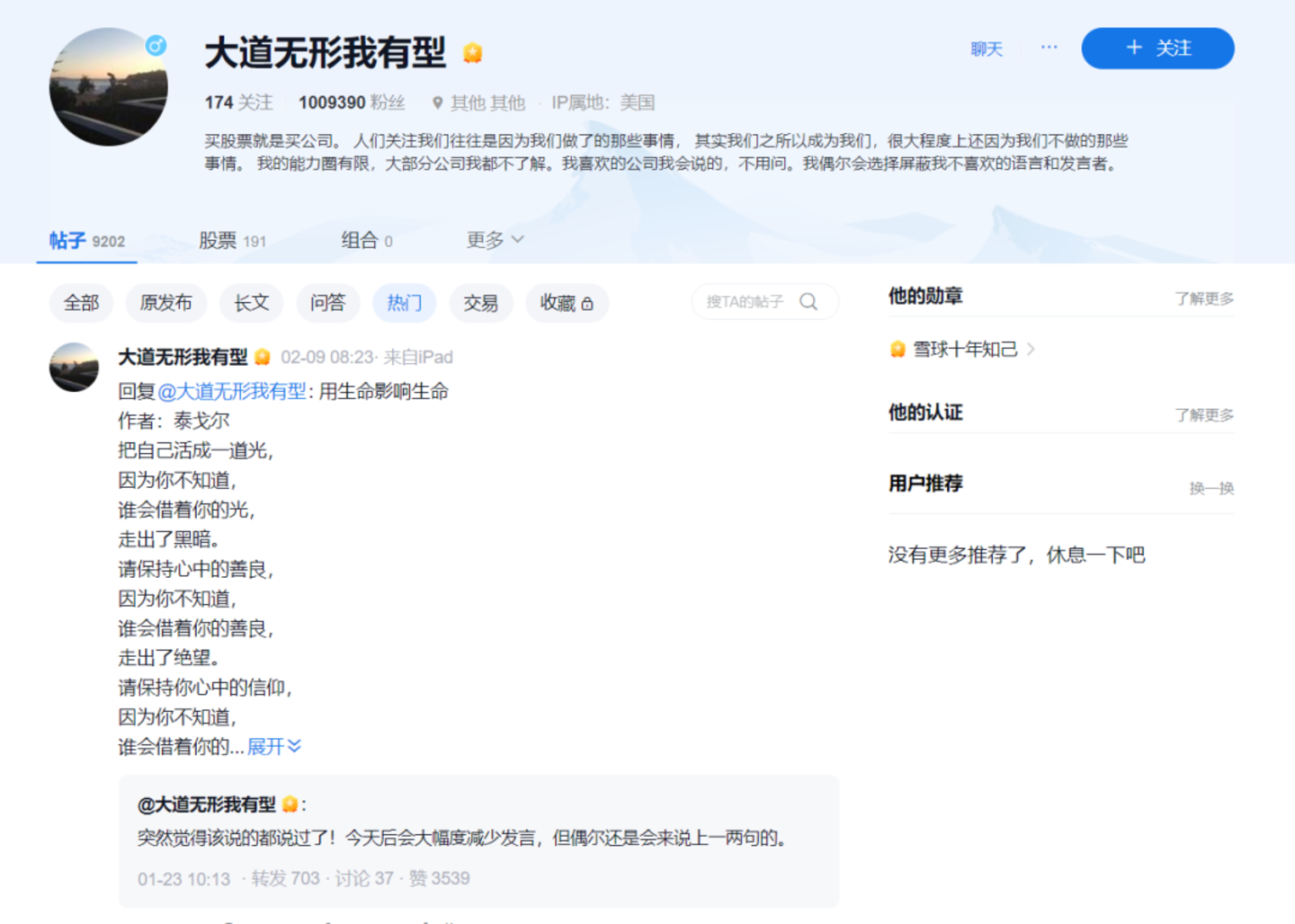 甚至比起后两位,段永平在国人心中地位更高。毕竟巴菲特和芒格如此遥远,段永平却不同。退隐江湖后,他以「大道无形我有型」活跃在投资平台雪球,网友亲切称呼他为「大道」或「阿段」。在这款注册用户6300万的垂直社区里,段永平拥有超100万粉丝,他几乎每天都和用户互动,回答大家提问,尽管其中多数提问其实都与投资无关。