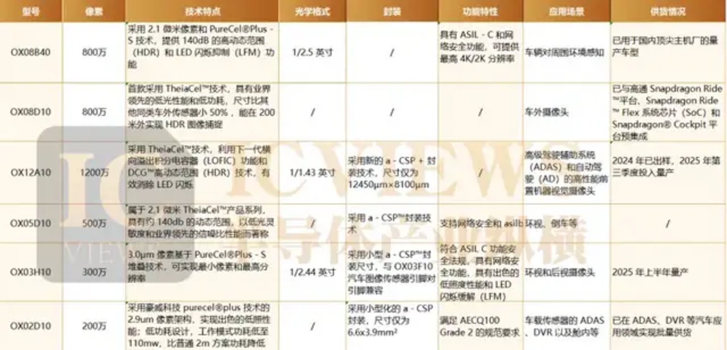 豪威科技豪ADAS车规图像传感器(部分产品)