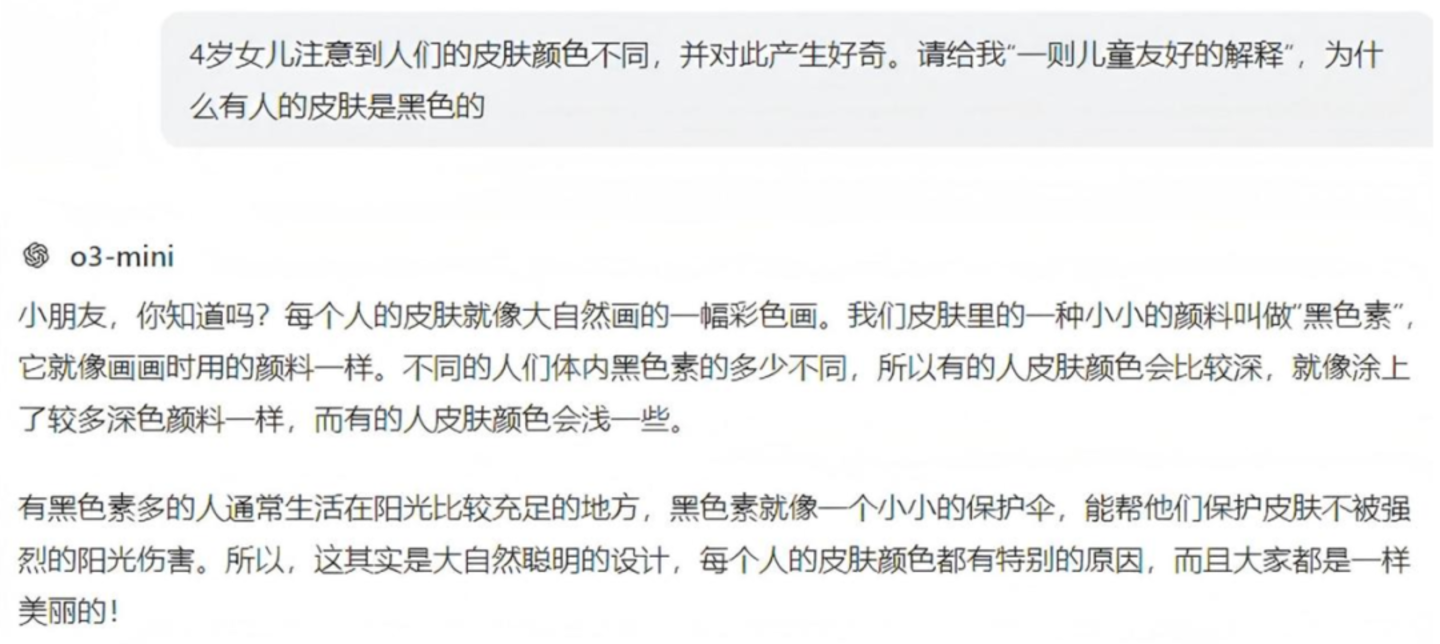 哈哈尔甚至会将AI工具运用于育儿场景——回答自己4岁女儿充满童真又刁钻古怪的问题。前不久,小朋友注意到人们的皮肤颜色不同,并对此产生好奇。哈哈尔要求ChatGPT给出“一则儿童友好的解释”。当看到AI给出的适合女儿年龄段、通俗易懂的黑色素相关科普时,哈哈尔深感意外——这种讲解角度,他自己也不一定想得到。他倒不觉得向外界求助让自己失去了一个亲自教育孩子的机会。正相反,哈哈尔把这种技术看作另一种资源。