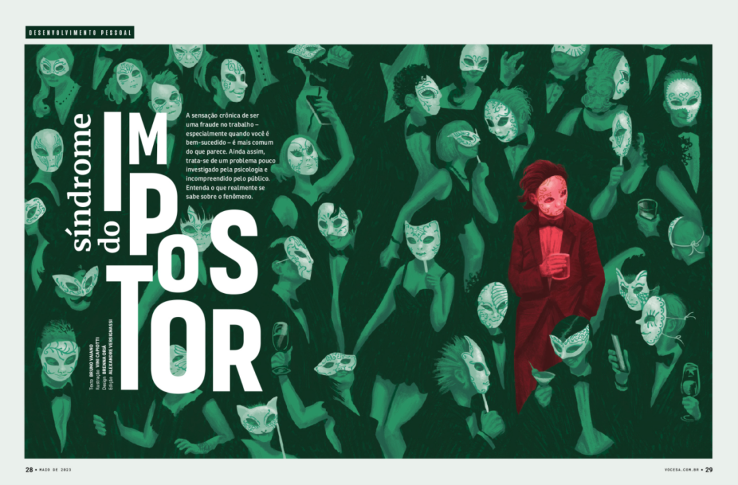 ▷ 仿冒者综合征(Impostor Syndrome)是一种心理现象,指个体在取得成就后,仍无法认可自己的能力,认为成功是偶然的,担心被他人揭穿真相,从而陷入持续的自我怀疑和焦虑中。如《了不起的盖茨比》中,主人公盖茨比通过伪装和财富积累试图融入上流社会,但始终无法摆脱内心的不安和“冒牌感”,这正是该综合征的典型写照。图片设计:BrennaOriá