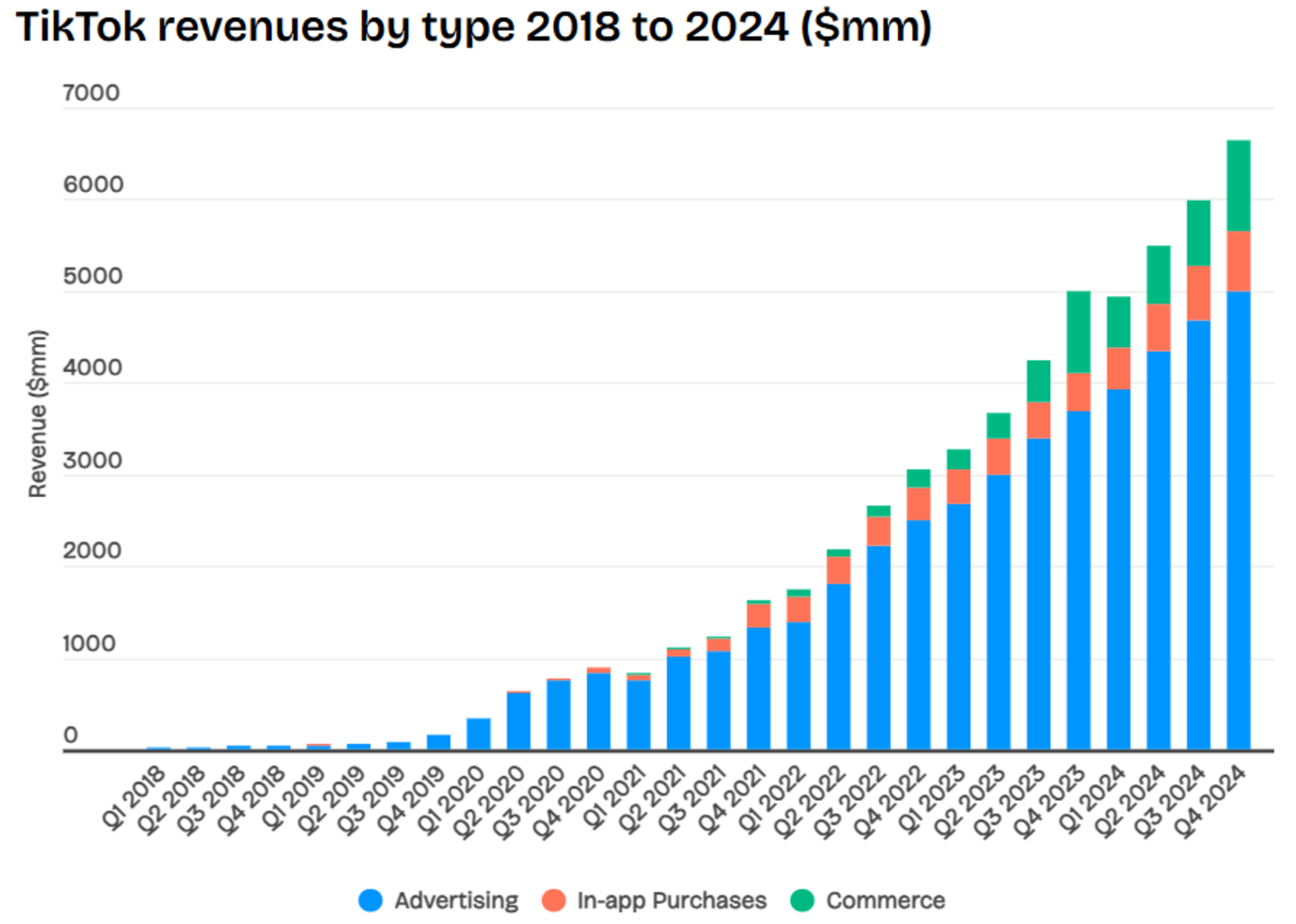 2018年-2024年TikTok各类别收入情况。数据来源:Apptopia, Sensor Tower, The Information