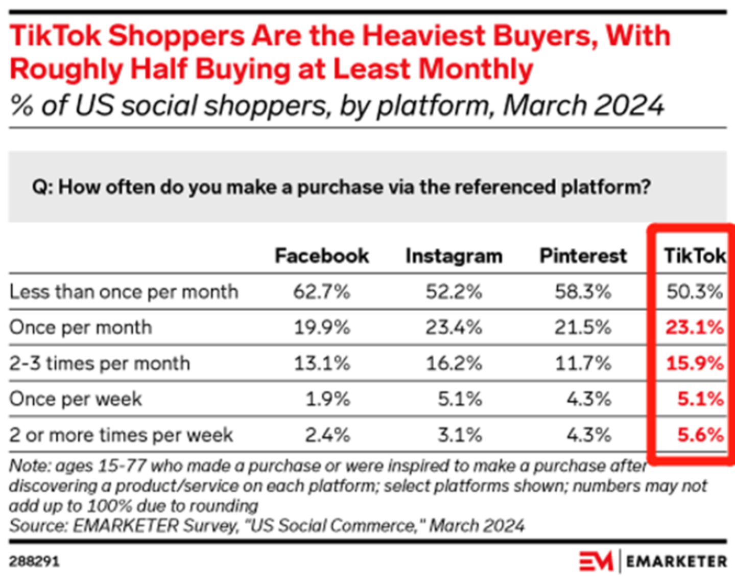 2024年3月美国社交电商用户各平台购物频次。图源:EMARKETER