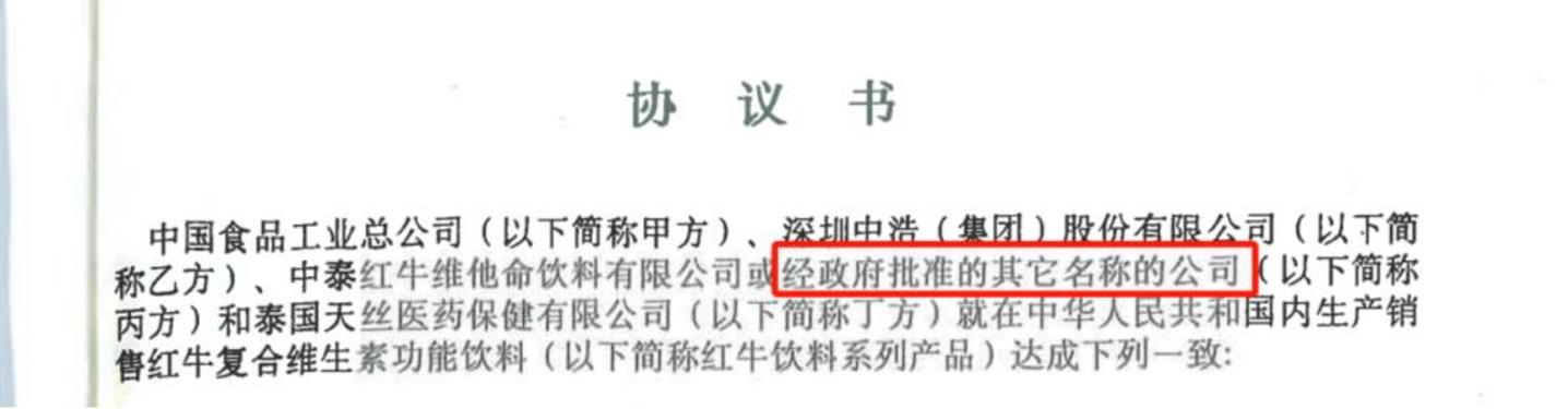 由于当时工商注册限制,合资公司经营期限最后的审批不能通过50年,因为四方签署了50年《协议书》,各方承诺,在50年协议期里,签署各方需保证合资公司独家在中国市场生产和销售红牛饮料。