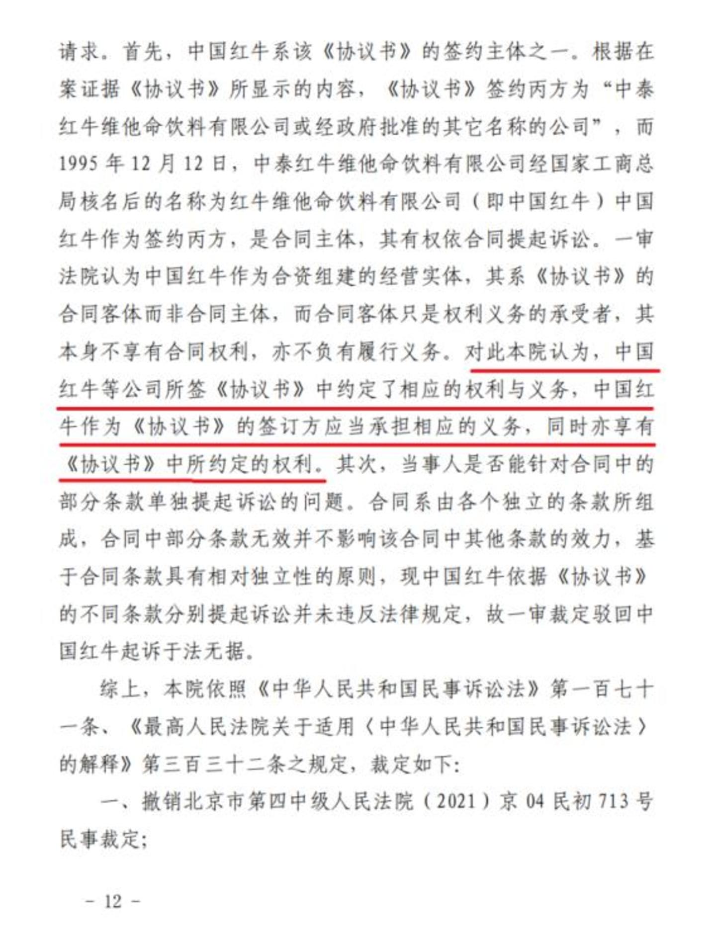 2023年,北京高院裁定,中国红牛是《50年协议书》签约主体,享有该协议约定权利。