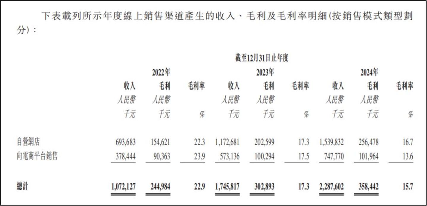 线上环节,不论是自营,还是向电商平台销售,在近两年来毛利率持续走低,营收增长转化至利润的能力不断被削弱:2024年线上收入同比增长31.04%至22.88亿元,但是毛利率从17.3%降至15.7%,导致同期毛利润仅同比增长18.15%至3.58亿元。