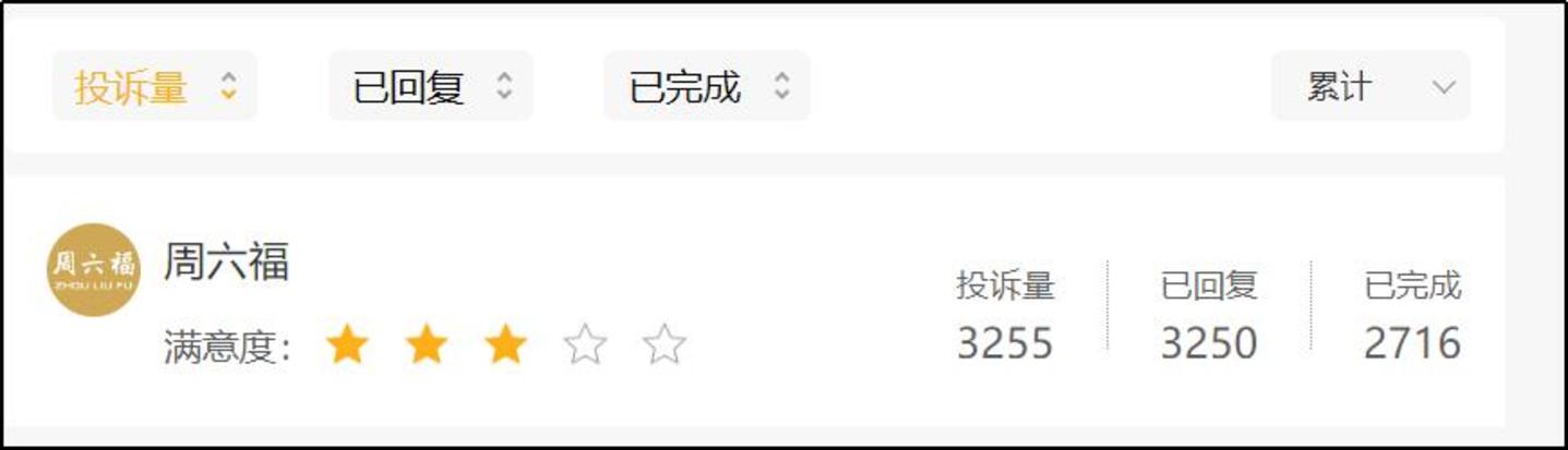 据《消费者报道》统计,2017年至2022年期间,周六福累计7次登上质检黑榜,遭到多个省市监管部门通报;而在黑猫投诉平台上共有3770条关于周六福的投诉,其中针对“诱导购买一口价”、“隐瞒克重”居多。