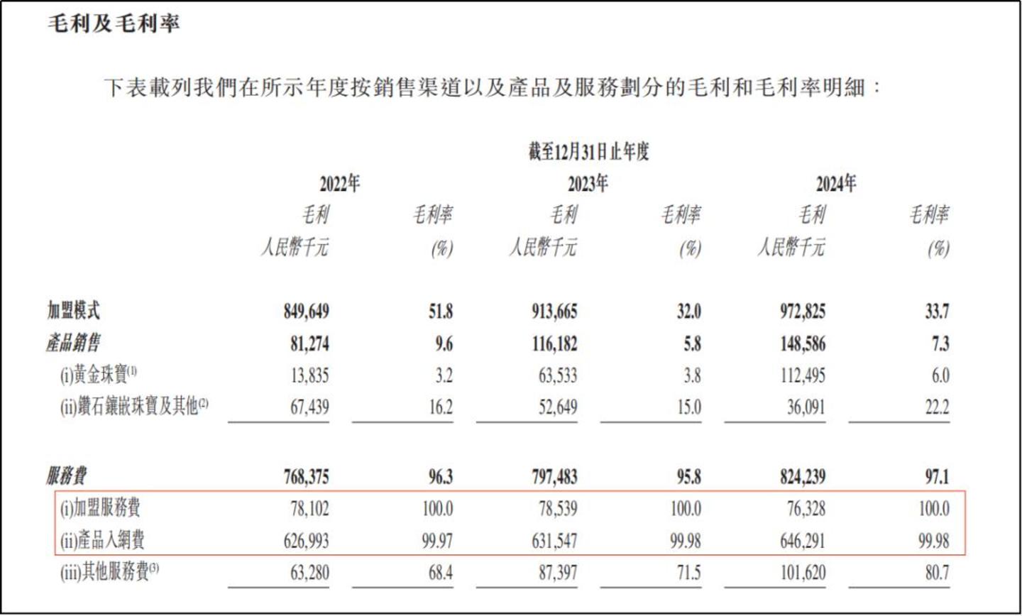 根据上市申请书数据显示,周六福营收中约50.5%来自于加盟生态,由“产品销售”和“服务费”两项构成,前者占总营收比重35.7%、后者占比为14.8%,但是两者的毛利率几乎是天然之别。