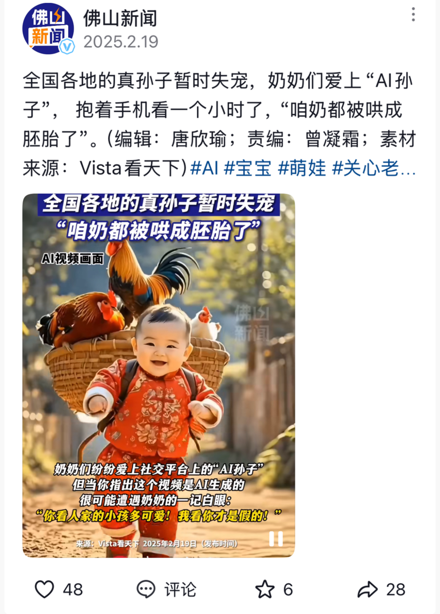 它像一种专供中老年人的新型文娱产品,真假不重要,重要的是「萌」「温情」。2025年《国民视觉健康报告》显示,60岁以上老年人日均手机使用时长达4.2小时,较五年前增长300%。这类产品满足了他们对可爱小孩、实用宠物、温情故事的需求,在陪伴较少的时候,也不失为一种情感陪伴。而妈妈告诉我,她收藏很多这类视频,也是为了逗孙女开心。