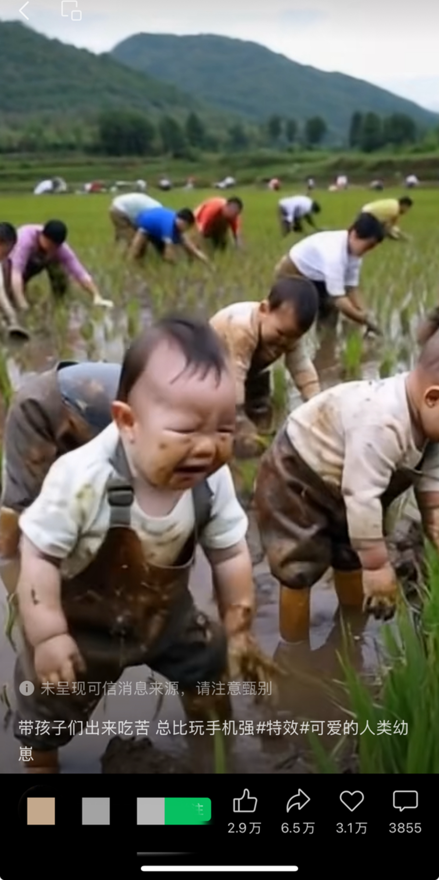 看着只有两岁左右的孩子跟着大人们下田插秧,弄的浑身是泥,哭了起来,配上文字「带孩子们出来吃苦,总比玩手机强」,评论区一众好评「挺好」「小宝贝真乖真可爱点赞」。一只大黄狗可以抱娃、拿着奶瓶喂奶,哄哇睡觉,评论区还是一片大拇指「比有些人还懂事。」偶尔还有一些长着天使的萌宠、会做菜的萌娃、从卷心菜里长出来的萌娃……