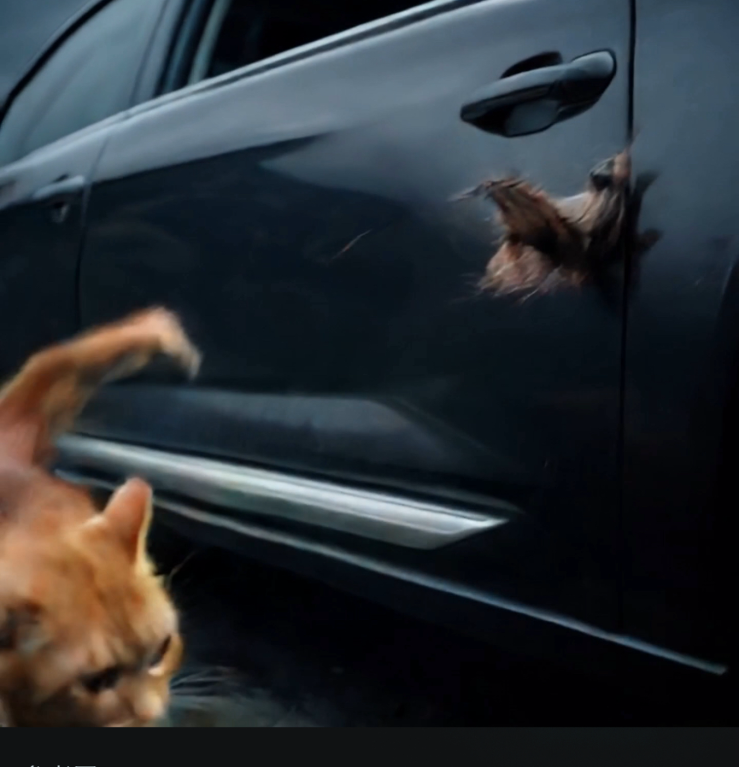 我选择了被群主点赞过的动物警示赛道,按照文档里的图片生成步骤生好了图片,把复制的指令放到可灵AI中生成,但生成的视频效果却并不好。猫的肢体动作有些扭曲,搭在车门上的爪子收起来后,猫耳朵却留在了车门上。群里还有人发来视频,车外的牛一直在跟着车的速度匀速倒走,无法达成视频里「动物向静止的车走来的效果」。