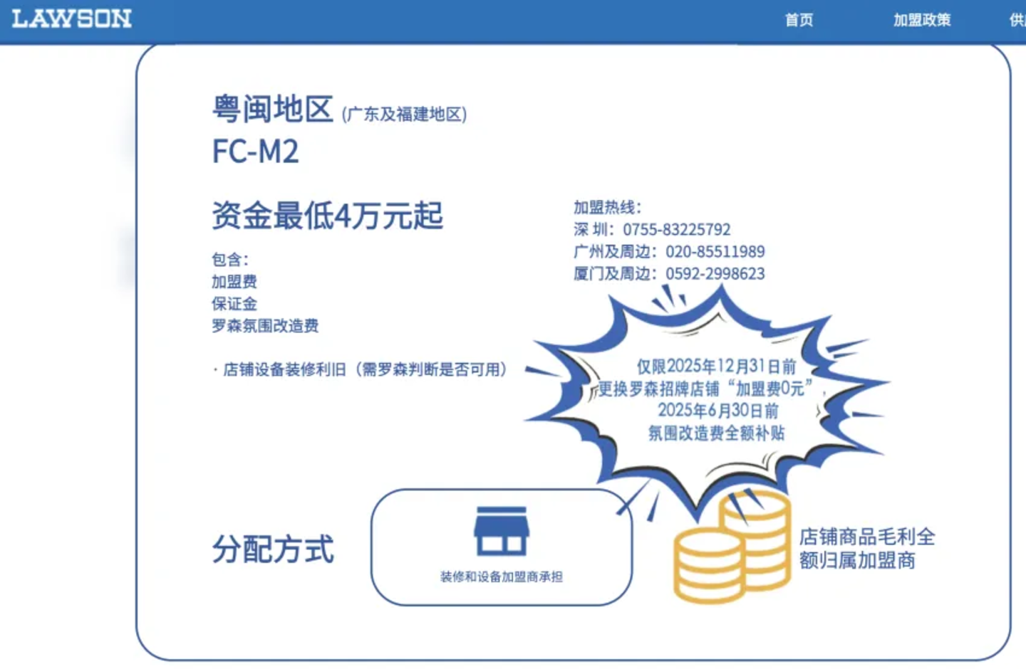 加盟信息显示,在粤闽地区(广东、福建)的罗森小站,加盟费最低4万元起,包含1万元加盟费、2万元保证金和1万元氛围改造费。只要店铺面积在20平米以上,就符合开店规定,合同年限为3年。如果加盟商在2025年内更换罗森小站招牌,则“加盟费0元”;如果在6月30日前完成,连氛围改造费也免了。
