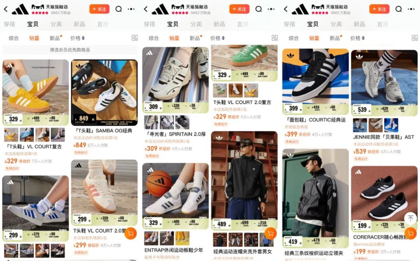 这种“价格还过得去”的流行爆款在阿迪达斯的产品矩阵里还出现过很多次。在它的天猫旗舰店上,销量最高的前20款产品,有17件的价格到手价格在550元以下,其中包括了多双与Samba款式相近的薄底德训鞋,还有它的三叶草经典款外套。