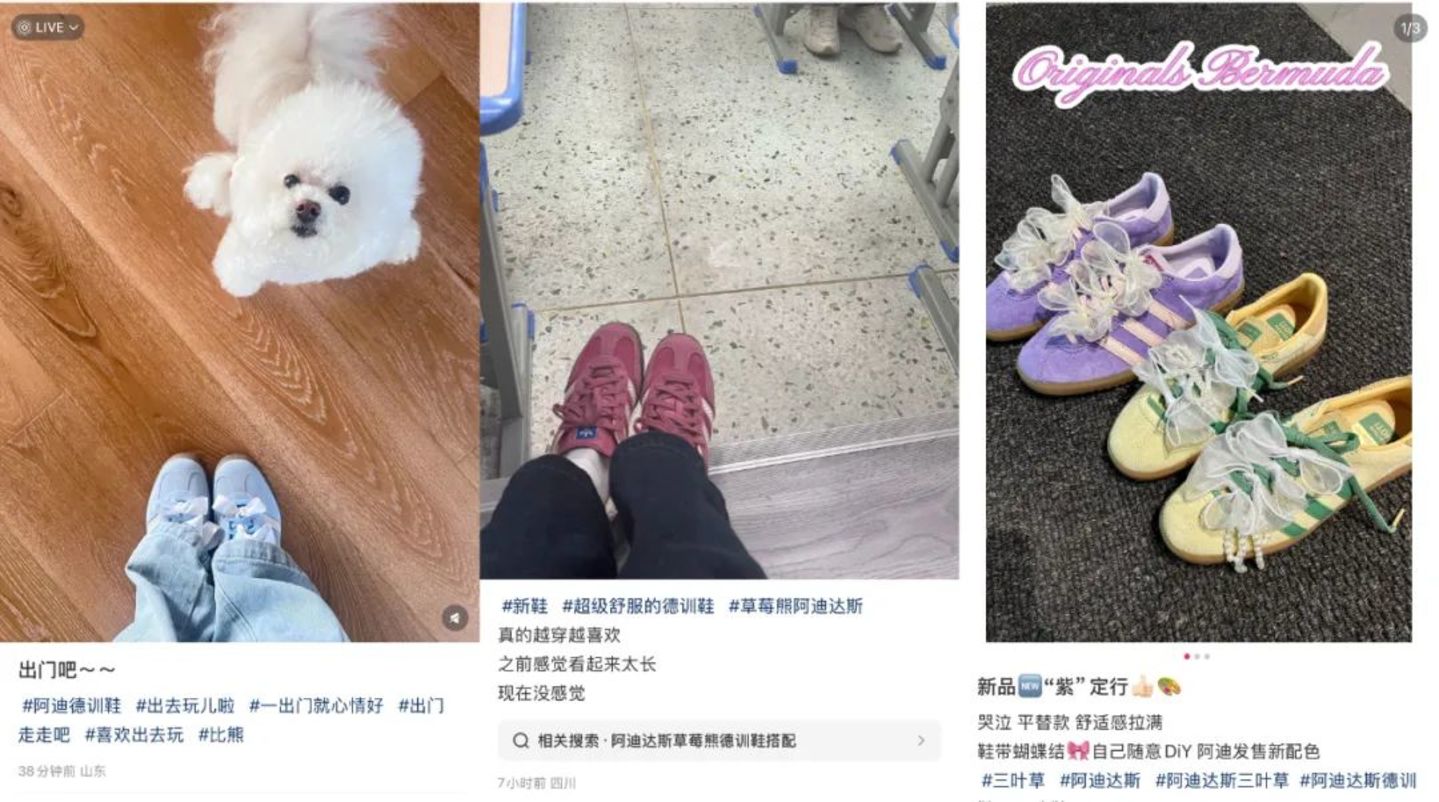但阿迪达斯的运动时尚,既不带班味儿,也不是中产味儿和“审丑”味儿。它可能是出门遛狗时,满脚背的浅蓝色蝴蝶结,可能是教室桌椅之间的过道里,一双“草莓熊配色”德训鞋,也可能是在一堆带了蕾丝和珍珠等少女装饰的鞋子里,有人问她到底该选冰淇淋蓝、柠檬黄还是香芋紫。