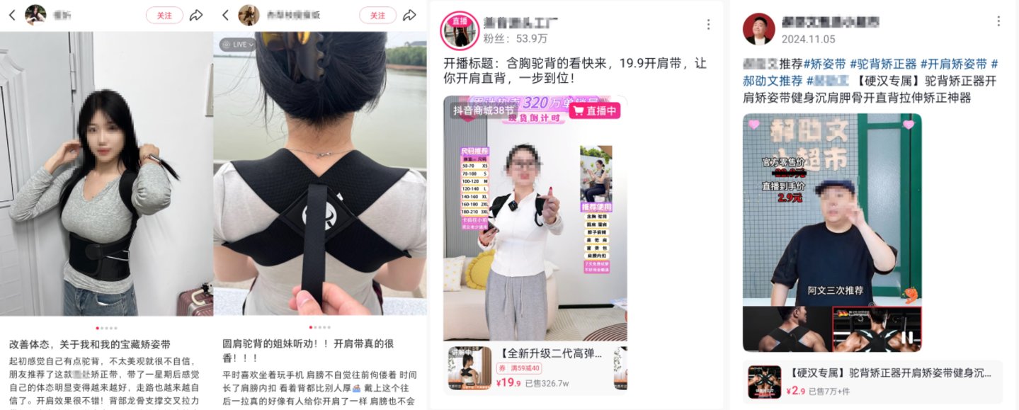 近日,小红书和抖音又频繁出现了一款名叫“矫姿带/开肩带”的产品,推广中宣称,那些被含胸驼背干扰的用户都可以购买,穿上之后就好像有一个大手把肩膀往后一掰,整个人都挺拔了起来,无论做什么都会是一个舒展的状态,气质也从一个“偷感很重的路人”变成“生活中的气质大女主”。