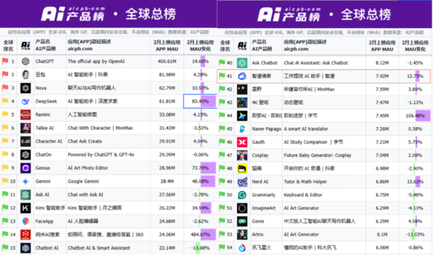 据AI监测平台“AI产品榜”数据显示,2025年2月AI应用MAU(月活数)全球TOP3分别为ChatGPT、豆包和Nova,DeepSeek紧随其后,月活数约为6181万。智谱清言排名第41位,约为792万,其收入主要来自高级会员订阅。