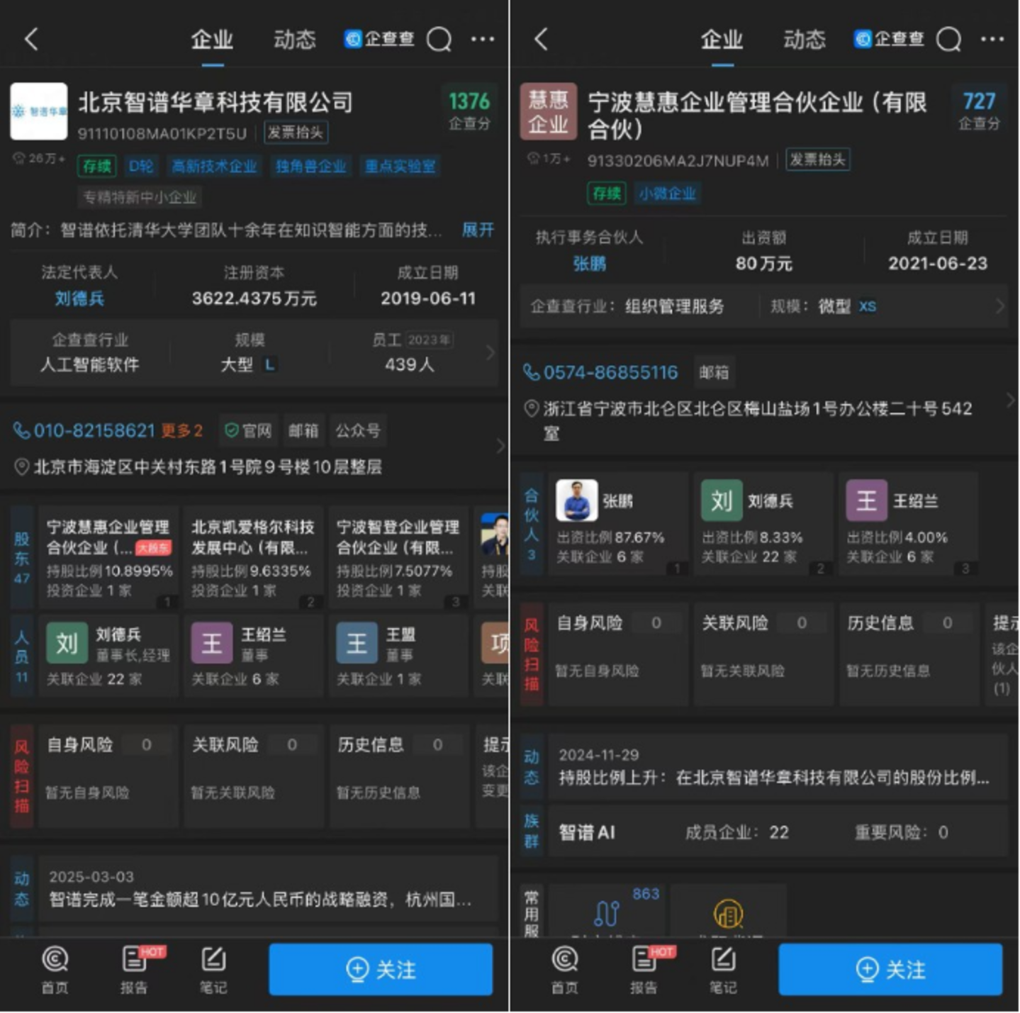2019年6月,智谱正式成立,主公司是北京智谱华章科技有限公司。张鹏、刘德兵和王绍兰作为合伙人创立宁波慧惠企业管理合伙企业(有限合伙),以10.8995%股份比例作为大股东控股智谱;唐杰则是智谱的最大自然人股东,企查查显示其持股比例7.5077%。