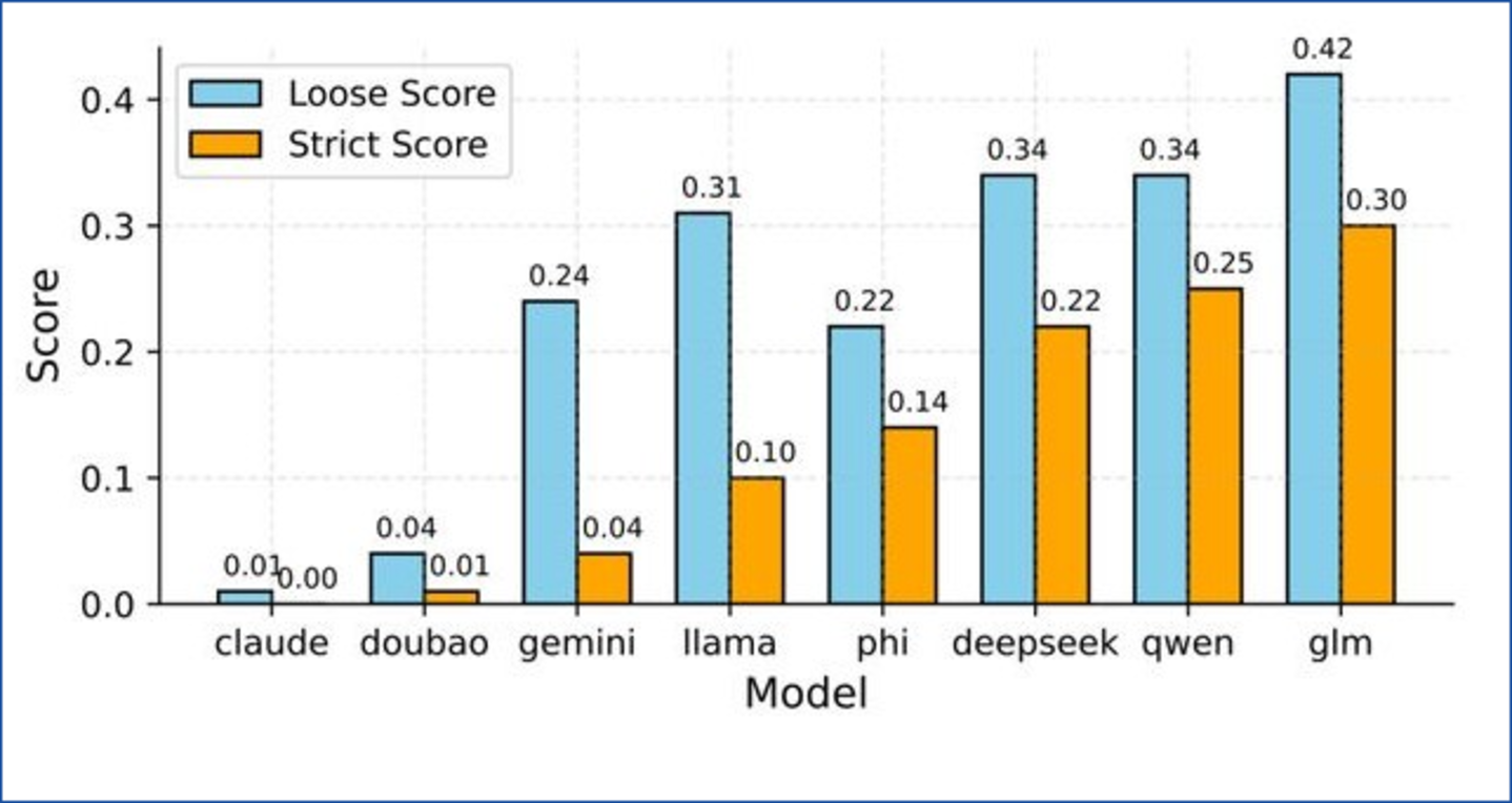 论文中选取了Claude 3.5-Sonnet、豆包Pro-32K、Gemini-Flash-2.0、GLM-4-Plus、Qwen-Max-0919、Deepseek-V3等模型进行测试,其中仅有Claude和豆包的宽松分数和严格分数最低,代表着其受蒸馏影响最小;而GLM-4-Plus、QwenMax和Deepseek-V3是疑似响应数量最多的三个大语言模型,说明它们的蒸馏程度较高。