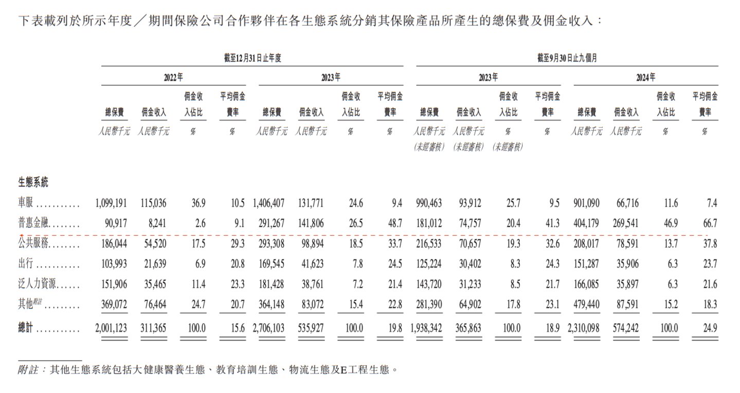 2022年,“普惠金融”的总保费约9千万,佣金收入824万,佣金收入占比2.6%,平均佣金费率9.1%。但到了2024年仅前9个月,“普惠金融”总保费超4亿,佣金收入近2.7亿,佣金收入占比46.9%,平均佣金率更是来到了66.7%。