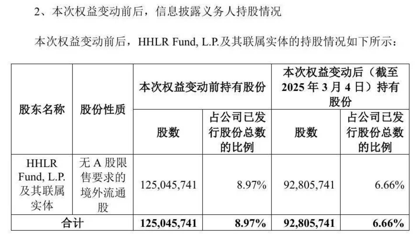 然而,当百济神州市值攀升之际,股东高瓴资本已多次减持套现。3月6日,H股百济神州发布公告称,2025年3月3日至3月4日,高瓴旗下的HHLR Fund等通过大宗交易方式减持百济神州境外流通股3224万股,此次套现约50亿港元。减持完成后,其持股比例从8.97%下滑至6.66%。