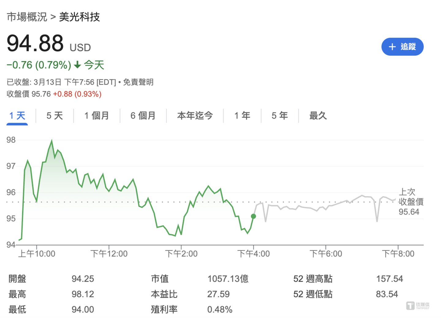 受消息影响,3月13日美股,美光股价下跌0.79%,市值蒸发了8.42亿美元(约合人民币61亿元),最新市值为1057.13亿美元。