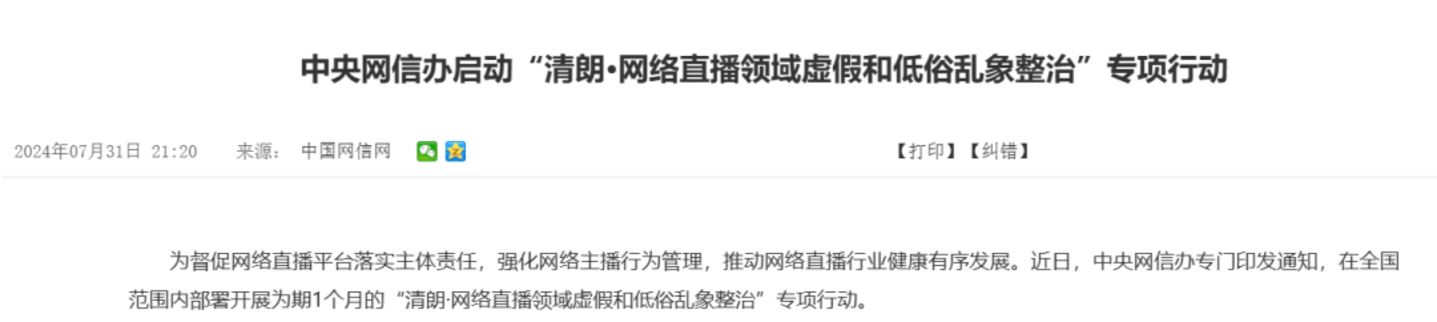 中央网信办于 2024 年 7 月启动的专项行动,将虚假流量问题列为重点整治对象,打击数据造假,针对直播中的粉丝量、浏览量、点赞量、交易量等数据造假行为,要求平台建立动态核验机制,对虚假数据进行清理。