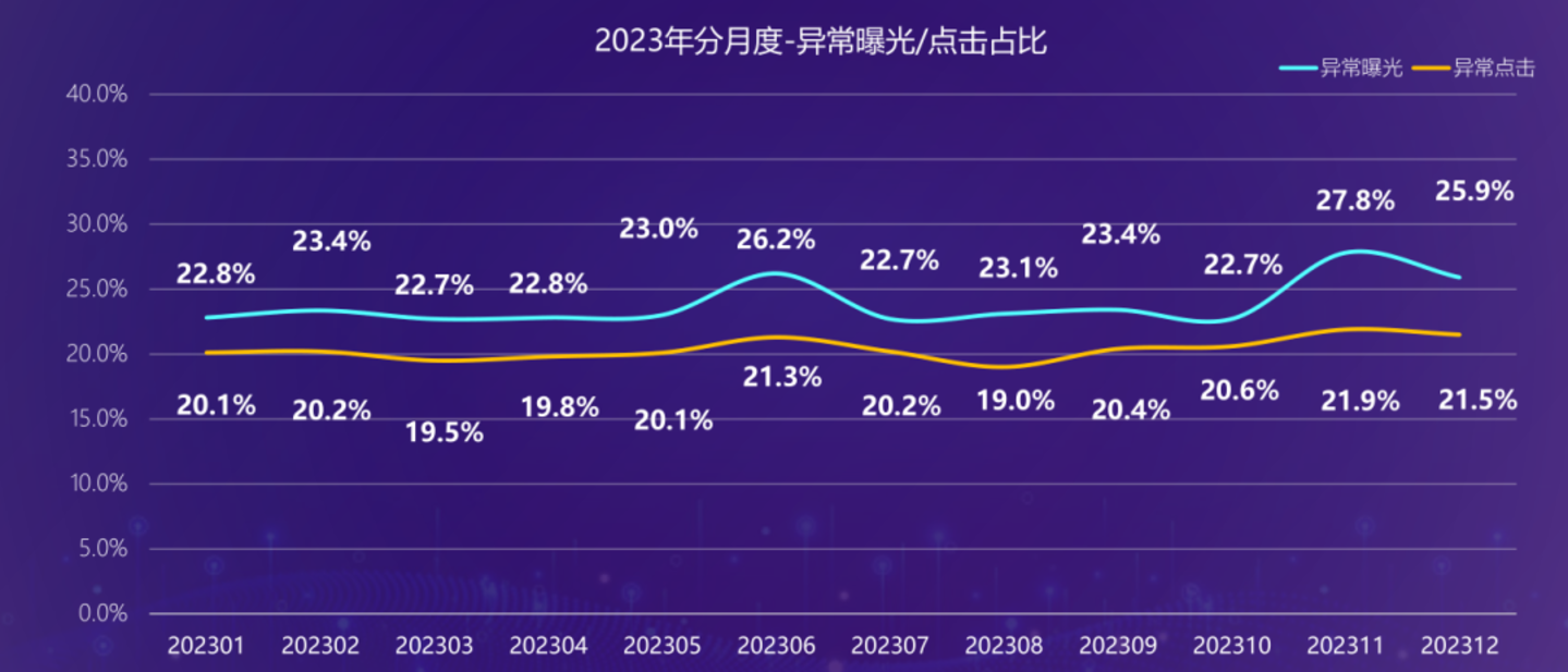 有数据显示,2023年全域广告异常曝光占比23.9%,异常点击占比20.4%。