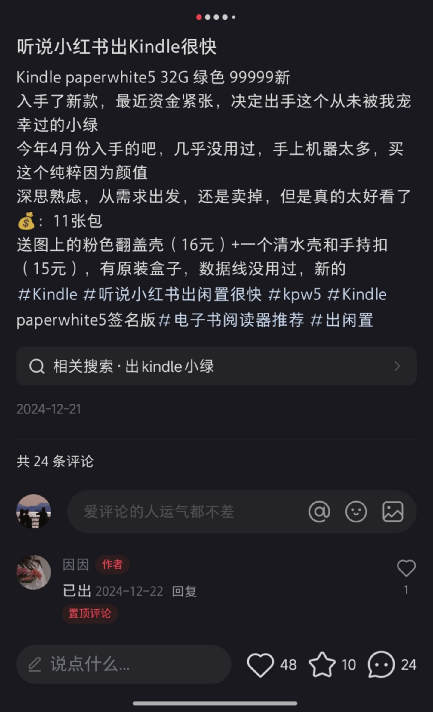 “我是周六把旧 Kindle 挂上网的,多个平台刚发布,就有人秒问详情,一个小时就出掉了,这速度有点出乎我的意料了。不仅如此,全天下来有近30个人询问,我最终不得不赶忙把帖子编辑标注:已出。”阿朱好奇地点开询问者的主页,大多是大学生或刚工作的年轻人,都说想买来充实自己。