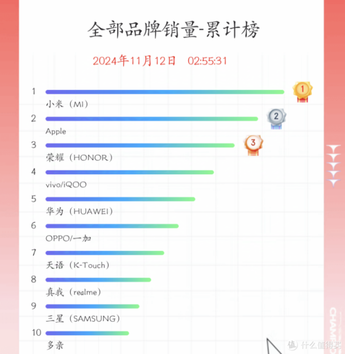 2024年双十一手机品牌累计销量榜单(图源:什么值得买网)