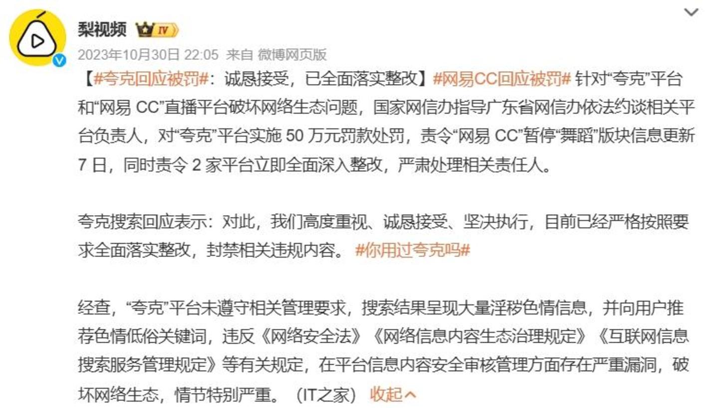 自2016年成立以来,夸克就一直以“无广告、纯粹搜索”为卖点,意图打造智能搜索的标杆。然而在2023年,夸克却被曝出搜索结果呈现大量淫秽色情信息,并向用户推荐色情低俗关键词,违反《网络安全法》等相关法规;对此,国家网信办指导广东省网信办依法约谈相关平台负责人,并对夸克实施50万元行政罚款,同时责令其进行全面深入整改。这一事件直接触及监管红线,对夸克的品牌形象和合规性带来不小冲击。