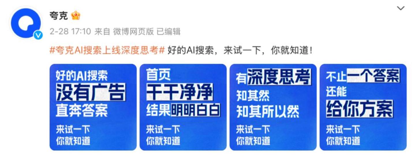 在2月末,也就是夸克AI搜索上线深度思考功能之际,夸克在官方微博上发布一期新的产品预告,文案上直接写明“好的AI搜索再也不必众里寻他”“没有广告”“干干净净”等内容,每一张海报几乎都在影射百度搜索,直指其长期以来为人诟病的广告问题。