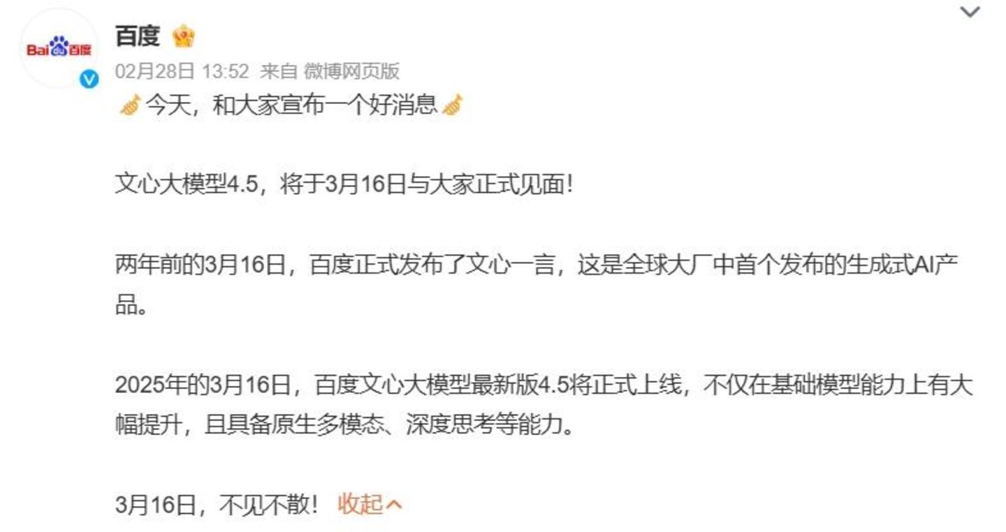 目前,百度已经把百度搜索和文心智能体平台接入DeepSeek,从而进一步提升智能化水平;此外,百度还将在3月16日发布文心大模型4.5。据百度官方介绍,文心大模型4.5在基础模型能力上有大幅提升,且具备原生多模态、深度思考等能力。