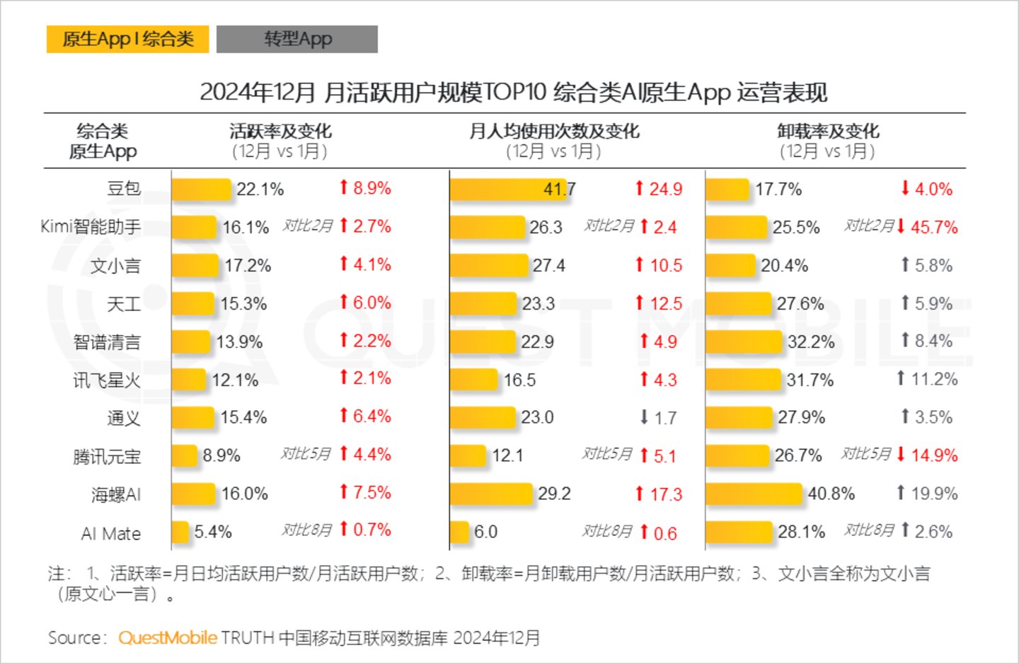 QuestMoblie 年初的报告显示,去年下半年综合类原生 App 在使用粘性上提升明显,然而大部分依然面临卸载率高的难题,AI 的价值尚未完全发挥。也是因为高卸载率,各家才需要不断拉新、继续投流,从而稳固市场份额。