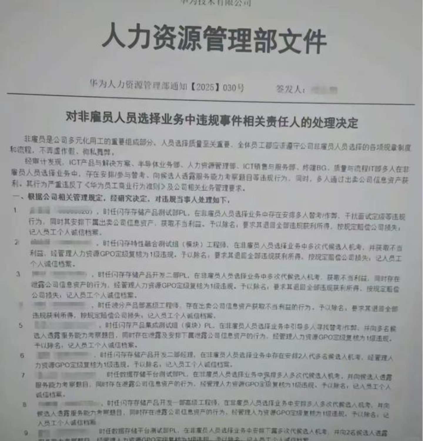 媒体报道显示,通报的文件题为《对非雇员人员选择业务中违规事件相关责任人的处理决定》。一位华为成都研究所员工告诉经济观察报,此次通报主要涉及华为成都研究所的数据存储部门。