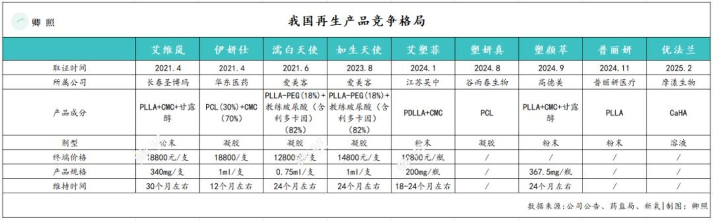 2021年我国爱美客的濡白天使、圣博玛的艾维岚相继获批,才开始补充我国医美市场合规再生材料产品的缺口。目前国内获批上市的产品有九款,涉及八个公司(见下图):
