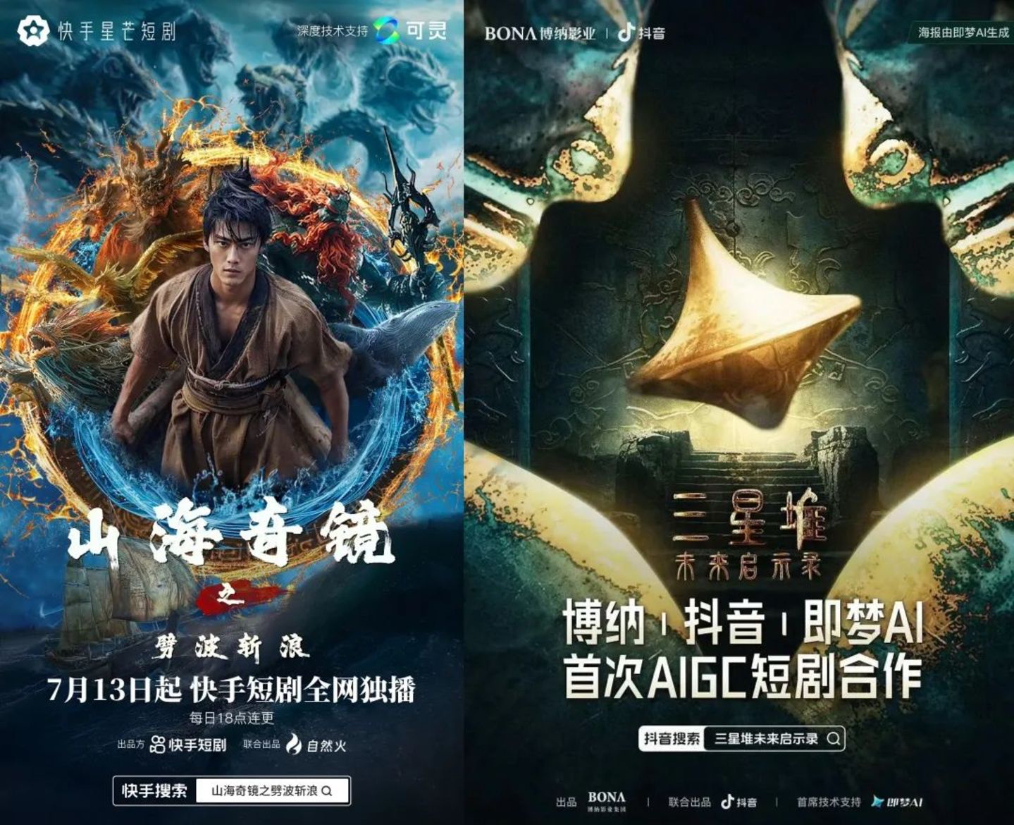 抖音下场,快手自然不甘示弱,迅速放出《山海奇镜之劈波斩浪》,用《山海经》的传说与三星堆的故事正面对垒。两部作品目前的播放量均超5000万。