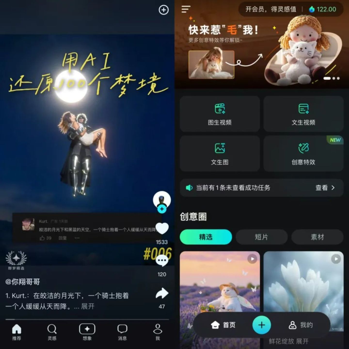即梦AI在创作者生态上更胜一筹。从APP界面上看,即梦AI就像AIGC版抖音,底部菜单栏里的“推荐”、“灵感”两个板块能浏览创作者作品并互动,“想象”则提供了AI生成工具,有图片生成、视频生成等多种玩法,创作完即可发布。而可灵AI目前的界面更强调创作工具性,用户无法评论其他用户创作的内容,用户间也无法互动。