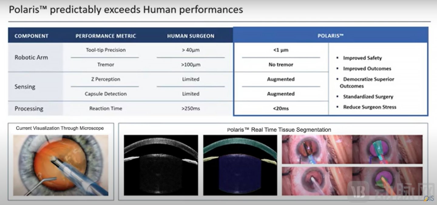 以去年10月拿下新一轮融资的Horizon Surgical Systems为例,该企业正在研发白内障手术机器人Polaris。根据企业官网信息,Polaris手术机器人系统集成了多项创新技术:其高精度机械臂具备优异的灵活性,可确保手术操作的精准定位;在医学成像领域,系统搭载了先进的数字显微镜与智能图像处理系统,可实时获取手术区域的高分辨率影像,并提供清晰的视觉反馈。此外,系统通过深度学习算法对手术数据进行智能分析,可实现手术风险预测,为医生提供科学决策支持。