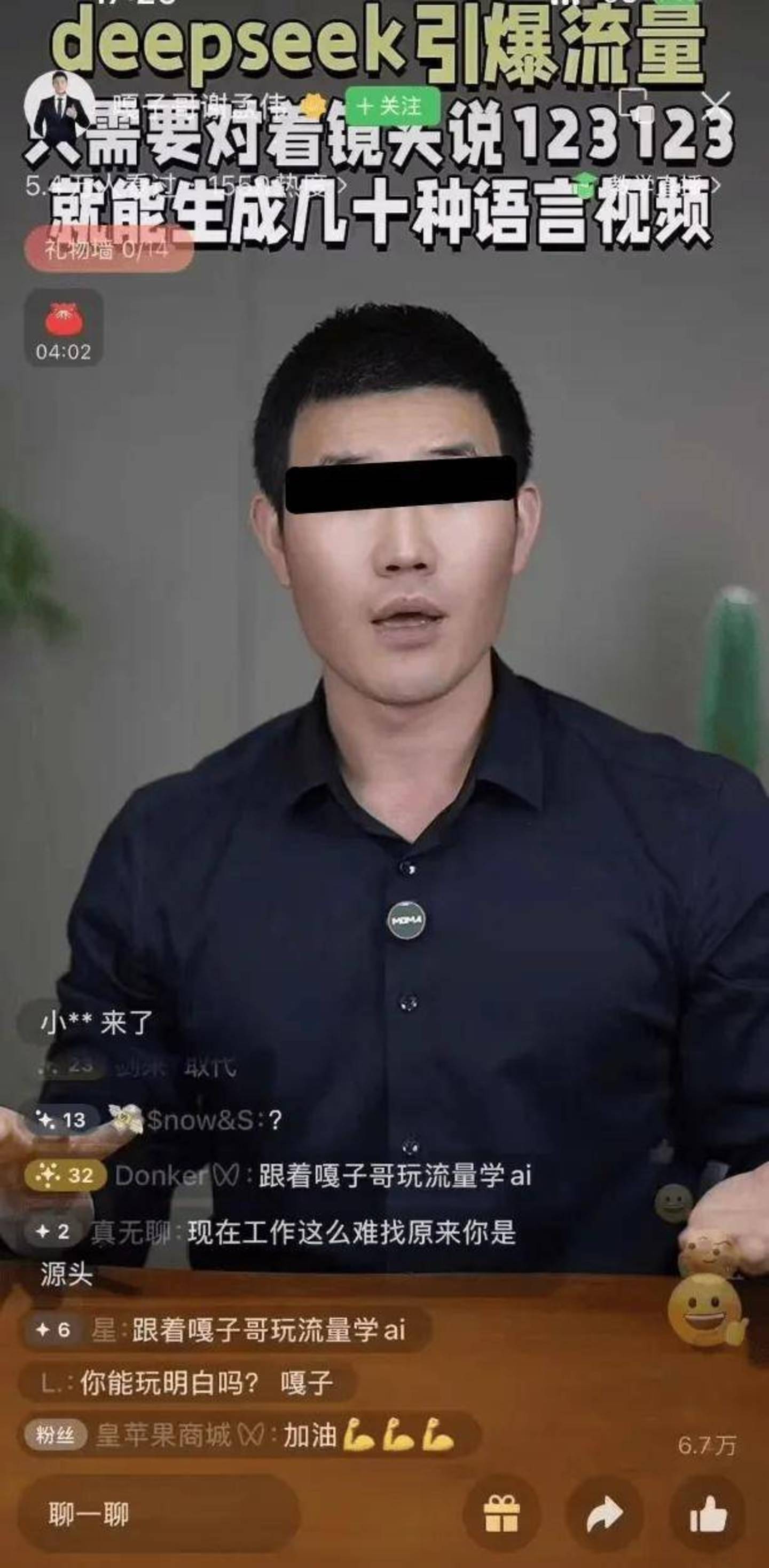 比如,凭借在《小兵张嘎》中饰演“嘎子”而走红的谢孟伟,近日就完美演绎了什么叫“互联网的尽头是卖课”。靠转卖AI课程,他成功斩获了一波流量。据直播截图显示,他在直播中宣称“deepseek引爆流量,只需要对着镜头说123123,就能生成几十种语言视频”,并由此引流售卖10.9元的“DeepSeek课程”。实则这门课程与他本人关系不大,和他之前卖酒、卖手机一样,都是返利推广。