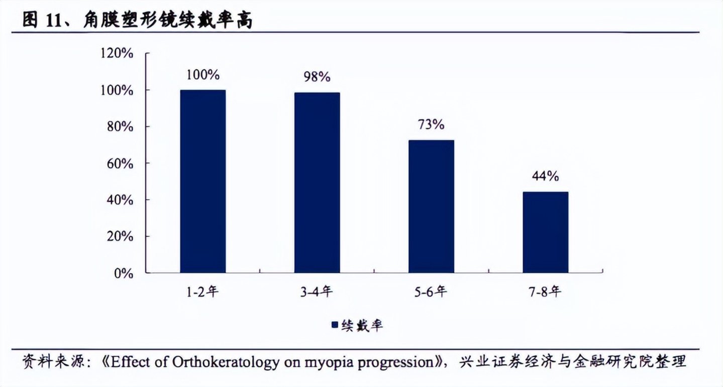 另外,值得一提的是,由于具有一定技术壁垒,以及存在供应链加价环节,一副OK镜销售价格并不便宜,可高达万元,同时产品使用寿命不长,用户和验配师也不会随意更改品牌,OK镜产品复购率很高。根据研究数据,OK镜用户中,1-2年、3-4年、5-6年、7-8年续戴率分别达100%、98%、73%、44%。