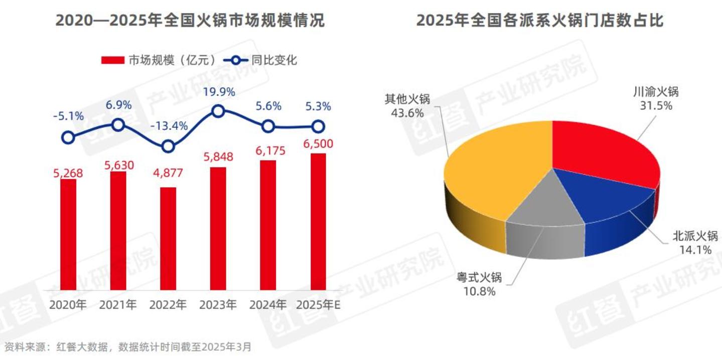 2024—2025年,全国火锅总门店数稳定在50万家以上,市场规模延续增长态势。据红餐大数据,2024年全国火锅的市场规模为6,175亿元,同比增长6.8%,预计2025年市场规模将达到6,500亿元。