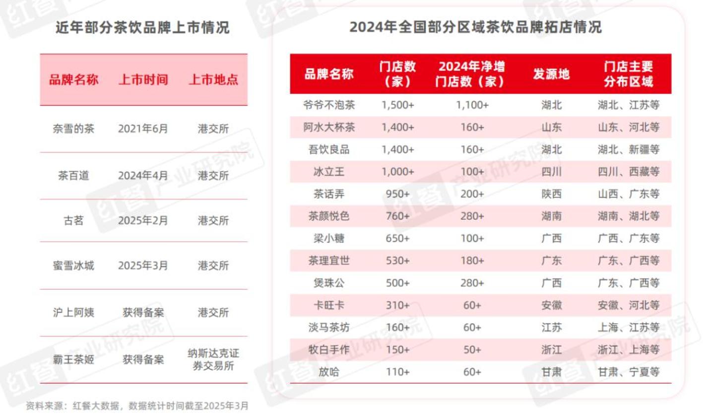 尽管茶饮市场竞争日益激烈,但蜜雪冰城、古茗、茶百道、沪上阿姨、霸王茶姬、喜茶等头部品牌均保持着强劲的发展势头。红餐大数据显示,截至2025年3月,蜜雪冰城的门店数已超过37,000家。另外,茶饮赛道的资本化进程进一步加快。继奈雪的茶、茶百道成功上市后,古茗与蜜雪冰城也相继登陆港交所,而沪上阿姨与霸王茶姬已分别获得港交所和纳斯达克证券交易所的备案,2025年或成为茶饮品牌上市大年。