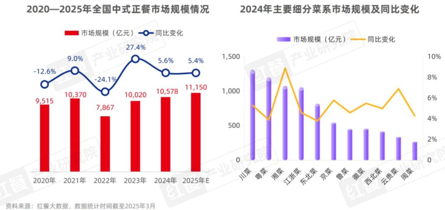 近年来,在文旅消费政策的持续有力推动下,地方菜在全国范围内蓬勃发展,带动中式正餐市场持续扩容。红餐大数据显示,截至2025年3月,全国中式正餐总门店数近136万家,预计2025年市场规模将突破1.1万亿元。