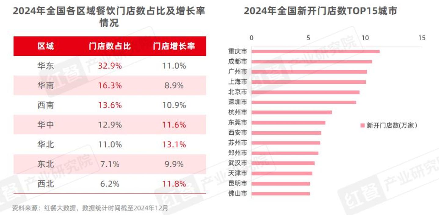 在这一背景下,众多餐饮品牌加速向中西部地区及下沉市场布局。红餐大数据显示,2024年,华北、西北和华中地区的餐饮门店数同比增速均超过11%,展现出强劲的发展潜力,成为行业增长的重要力量。诸如西安、郑州、武汉等中西部城市也成功跻身于2024年全国新开门店数TOP15城市榜单。